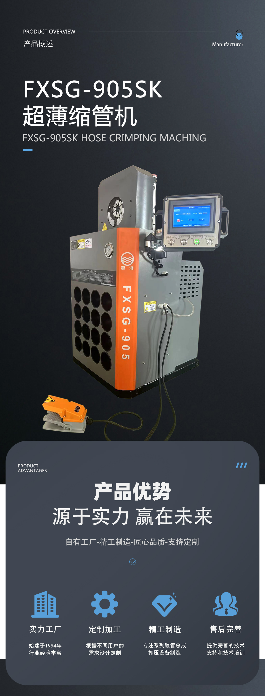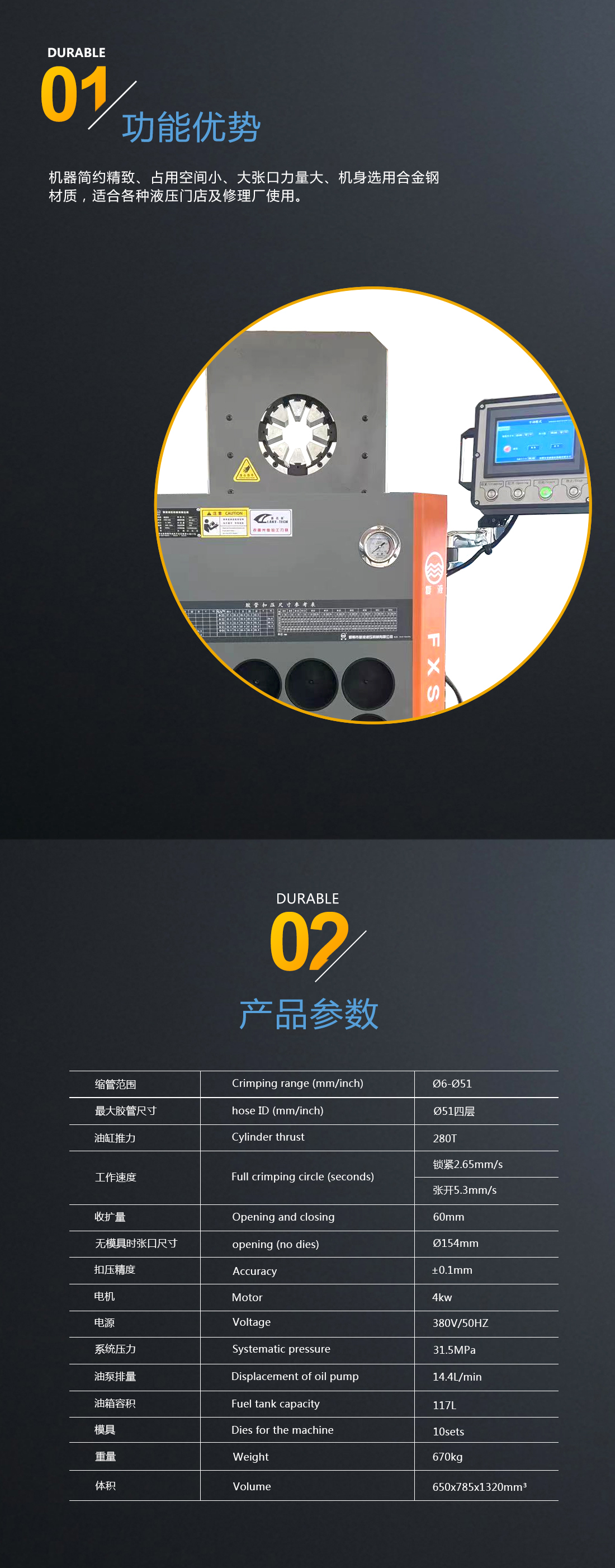 我公司新研發(fā)成功了超薄系列縮管機,扣壓重復精度可達到0.1mm。超薄的結(jié)構(gòu)形式克服了傳統(tǒng)環(huán)形扣壓機固有的不足,能夠非常方便的扣壓形狀復雜的高壓油管總成和異型軟軸軟管。此款機器外觀尺寸更小,采用人性化設(shè)計,更方便使用者操作??刂葡到y(tǒng)采用的是PLC+觸摸屏模式,位移傳感器采集信號精度高,系統(tǒng)可采用手動、半自動和全自動三種模式,用戶可根據(jù)實際加工的工況非常方便的進行選擇,從而大大提高加工效率。在您使用的過程中如遇到有不方便之處請及時與我們聯(lián)系,我們將以不懈的努力提高您的產(chǎn)品質(zhì)量和工作效率。